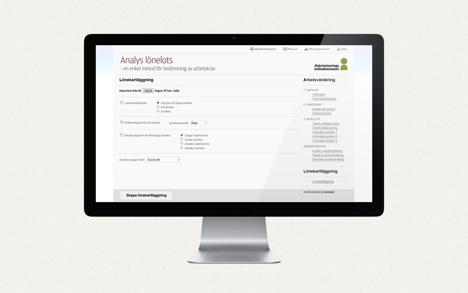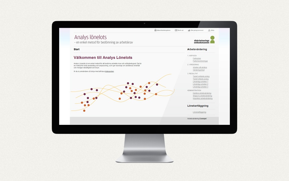 Through a user-friendly interface, the user can map salaries, evaluate jobs, export excel files and print tables. The programme is built using web technology. All views are written in html. This provides good flexibility in the interfaces that users are already used to. The things that cannot be done in the web format are programmed directly into the accompanying browser. Technically, Analys lönelots is prepared to be put on a server where several people can work on the same job evaluation.